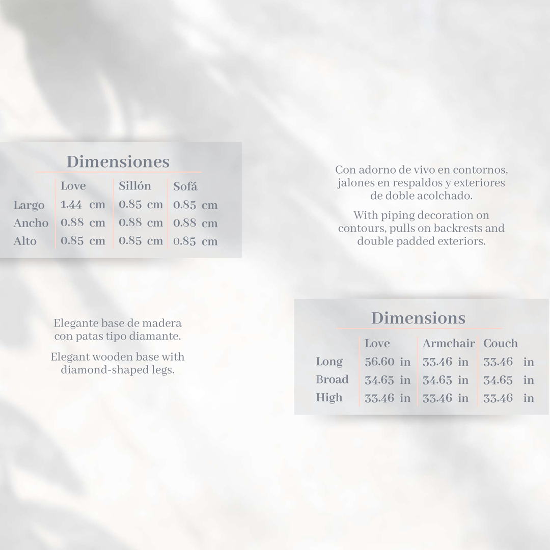 Con adorno de vivo en contornos, jalones en respaldos y exteriores de dobleacolchado.