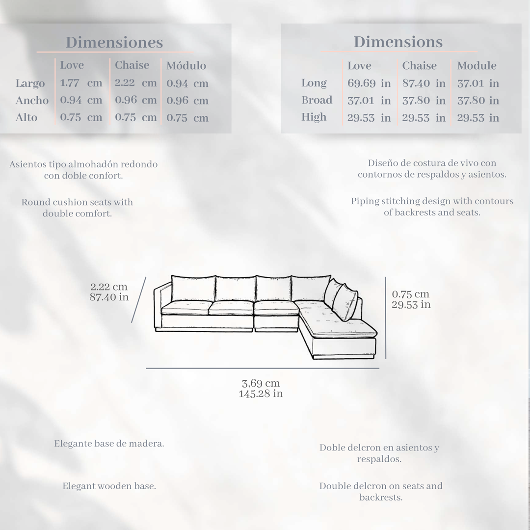 Sala modular, con diseño en L, fabricada con madera sólida y tapizada con tela poliéster de la mejor calidad.